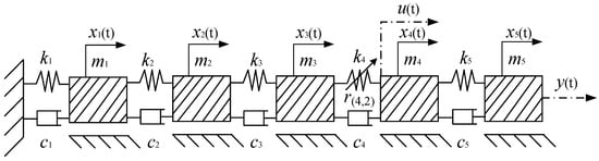 In this subsection, structural damage of varying degrees is simulated by introducing a single spring with different nonlinear stiffness values into a one-dimensional 5-degree-of-freedom system. Since the NDE and NARX models, along with their GALEs, are applicable only to Single-Input Single-Output (SISO) systems, the one-dimensional 5-degree-of-freedom system shown in Figure 3, which is a Single-Input Multiple-Output (SIMO) system, requires specific treatment. To address this, the output response of the fifth mass block is selected as the system’s output. The NARX model identification is then conducted using the input excitation applied to the fourth mass block and the output response from the fifth mass block.