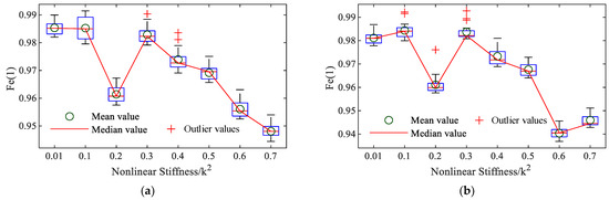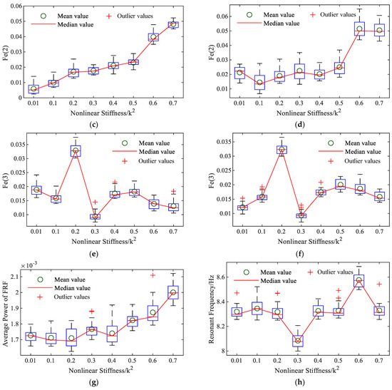 From Figure 7, it can be observed that only the nonlinear indicator Fe(2) in Figure 7c exhibits a monotonic change with increasing nonlinear stiffness. Therefore, Fe(2) can be effectively used to assess the system’s state. To highlight the advantages of structural damage detection based on nonlinear vibration methods, a comparison is made with the method relying on the average power of the FRF and first-order resonant frequency. As shown in Figure 7g,h, these linear approaches are not monotonically related to an increase in nonlinear stiffness (or damage).