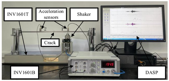 The experimental study utilizes a vibration and control experimental system (type: INV1601) developed by China Orient Institute of Noise & Vibration. This system comprises three main components: (1) vibration teaching experimental bench (type: INV1601T); (2) vibration teaching experimental instrument (type: INV1601B); and (3) vibration teaching experimental software (version: INV1601 DASP). The system is illustrated in Figure 8.
