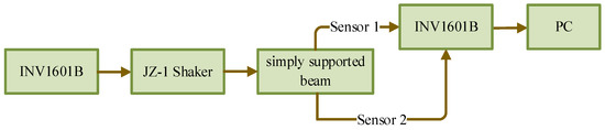 The experimental procedure is illustrated in Figure 9. The process begins with the generation of a swept excitation signal ranging from 10 Hz to 1 kHz, which is produced by the integrated module (INV1601B), incorporating both a power amplifier and function generator. This excitation signal is subsequently applied to the simply supported beam via an electromagnetic shaker (JZ-1). During the experiment, response signals are simultaneously captured by two sensors (Sensor 1 and Sensor 2), with the acquired data being transmitted through the integrated module (INV1601B) to a computer for subsequent processing. The position of the sensors was placed at the left and right third of the beam. This data collection process yields the necessary dataset for NARX model identification. The experimental parameters included a sweep excitation duration of 4 s and a sampling frequency of 1024 Hz.
