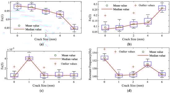 The nonlinear index Fe(n) is calculated for specimens with varying crack depths. To enhance the reliability of the experimental results, steps a to d are repeated, and each group of specimens with different crack depths is tested five times. Figure 13 presents the nonlinear indices Fe(1), Fe(3), and Fe(5), derived from the analysis of 10 sets of experimental data.