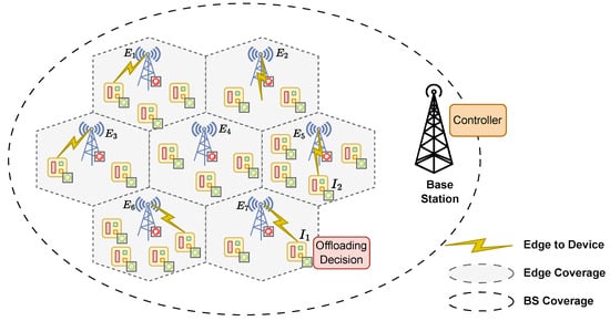- When , device offloads the task to its local edge server. In this case, the total delay can be computed as the sum of the wireless transmission delay and the computation delay at the local edge: