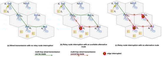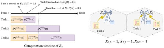 - If the task was offloaded from a remote device (), the interruption delay includes both wireless and wired transmission delays:where represents the index of the device whose task arrival updated the server’s load and triggered the interruption, and is the index of the local edge server of device .