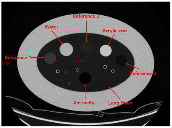 To evaluate the performance of the proposed method, we used the COPD gene2 phantom (CTP698; The Phantom Laboratory, Schenectady, NY, USA), as shown in Figure 2. The phantom comprises air and water sealed in silicone cylinders, an acrylic rod, and three reference foams with different densities. The nominal densities of the reference foams are 64.2 kg/m3, 192.6 kg/m3, and 321.0 kg/m3, respectively [9,10]. These reference foams are surrounded by an oval-shaped lung foam with a measured density of 160.2 kg/m3, corresponding to normal pulmonary parenchyma [10].