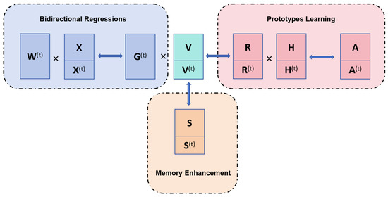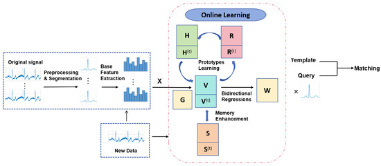 The problems with online ECG biometrics can be summarized as follows: (1) We want to create a latent learning space where samples can have discriminative representations. To transform data from base features to this space, we need to create a projection matrix . (2) At each round, our method should learn from current data that contain both extracted features and the label information; is obtained from the original ECG signals. The detailed methodology used in this paper is presented in Section 4. The label information can tell us to which individual each sample belongs. Furthermore, one individual’s different samples should have similar representations to each other. As mentioned above, the proposed framework is designed in the online mode, with three well-designed modules, i.e., bidirectional regressions, prototypes learning, and memory enhancement. The flowcharts for these modules are shown in Figure 2. As shown in Figure 2, all three modules contribute to learning discriminative features, and the technical details for these modules are provided in Section 3.2, Section 3.3 and Section 3.4.