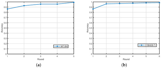 We also conducted further experiments on the MIT-BIH and CYBHiDB-T1 datasets to validate the convergence of our method, and the results are shown in Figure 4. As shown in Figure 4, the accuracy improves steadily with increasing iterations, and the algorithm always converges within six iterations for the two datasets, confirming its convergence and efficiency.