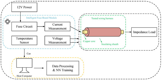 In terms of software, the voltage, current, and temperature data collected by the intelligent fuse module are converted from analog to digital and transmitted to the PC upper computer through the CAN-to-USB interface. Perform data cleaning, normalization processing, remove outliers and noise, and improve data quality. The processed data are used for neural network training. The overall structure is shown in Figure 3.