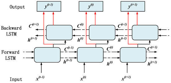 The bidirectional long short-term memory network (BiLSTM) selected in this article is a variant of LSTM. It processes sequence data by introducing two LSTM layers, capturing the forward and backward dependencies, and fusing the hidden layer states through weight coefficients [20,21,22], providing a more comprehensive data perspective. Its unit structure is shown in Figure 4.