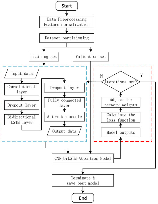 Prior to model construction, raw data undergo systematic processing: temporal features are extracted through data cleaning (e.g., handling missing values and outliers), followed by Min–Max normalization to eliminate feature scale discrepancies. The dataset is then split into training and validation sets while preserving temporal continuity. The input data are fed into the model, which sequentially consists of a convolutional layer (Conv1D, kernel size 1, 64 filters), a first dropout layer (rate 0.3) for random neuron deactivation to mitigate overfitting, a bidirectional LSTM layer (BiLSTM, 64 units per direction, a second dropout layer (rate 0.3) for enhanced regularization, a fully connected layer for nonlinear feature transformation, an attention mechanism to dynamically weight critical time steps, and finally a Sigmoid output layer for prediction.