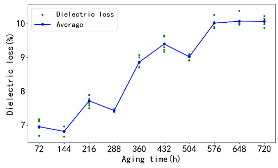 The results of the high-temperature accelerated aging experiment are shown in Figure 7. With the extension of aging time, the dielectric loss value shows a certain increasing trend. This phenomenon is due to the accelerated molecular motion inside the material caused by the high-temperature environment, resulting in an increase in the polarity of the material and thus an increase in the dielectric loss. In addition, the high temperature promotes chemical decomposition or cross-linking reactions inside the material, which may generate more charge traps or defects, thereby increasing the dielectric loss of the material.