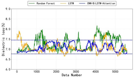 Figure 8 show the predicted values analysis of the same test sample wire harness, with an actual dielectric loss value of 7.17%. Among the continuously predicted values of about 5000 points, the CNN-BiLSTM-Attention model’s predicted values are more convergent to the actual values than other models, with a smaller fluctuation range. This indicates that the model can more accurately capture the complex features and dynamic changes in data, while the predicted points of LSTM and Random Forest models show greater dispersion. Further verification shows that the CNN-BiLSTM-Attention model outperforms the other two models in evaluation metrics such as mean square error (MSE) and mean absolute error (MAE).