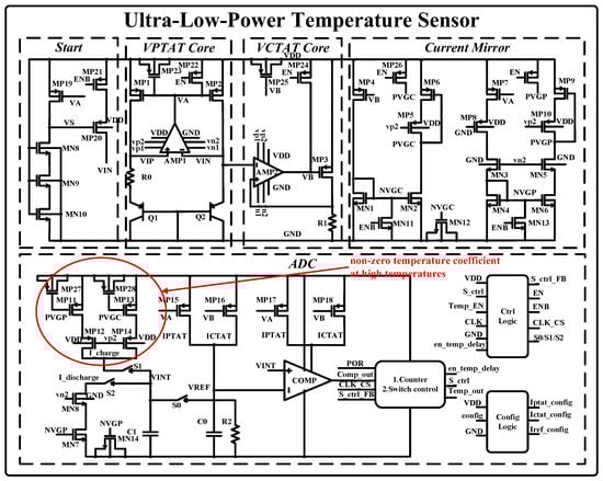The proposed temperature sensor’s architecture is depicted in Figure 2. The overall circuit is divided into a startup circuit, positive-temperature current-generating circuit, negative-temperature current-generating circuit, current mirror circuit, and ADC circuit. In addition, there are control signal generation circuits and configuration circuitry for critical currents. The core element is the current-generation stage of the VPTAT, designed using a conventional bandgap reference circuit. A high-gain operational amplifier provides negative feedback, ensuring voltage equilibrium between VIP and VIN. The positive temperature coefficient is generated across a zero-temperature-coefficient resistor , producing a proportional positive-temperature-coefficient current. Simultaneously, the voltage of transistor induces a negative-temperature current across the zero-temperature resistor through buffering. Matching and minimizes resistance-induced temperature errors. All mirror nodes in the circuit are added to the filter capacitor and the initial pull-up or pull-down control, so the system has a stable initial state and working state.
