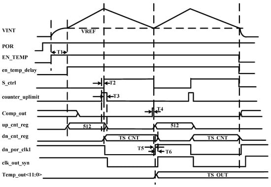 Table 1 and Figure 3 provide a timing depiction of the voltages at critical nodes in the circuit, as well as a timing depiction of the critical registers inside the counter. The en_temp_delay signal is used to control the switch S0 to establish the initial state of the system. The signal S_ctrl is used to control the charging and discharging of the integrated capacitor by switches S1 and S2.