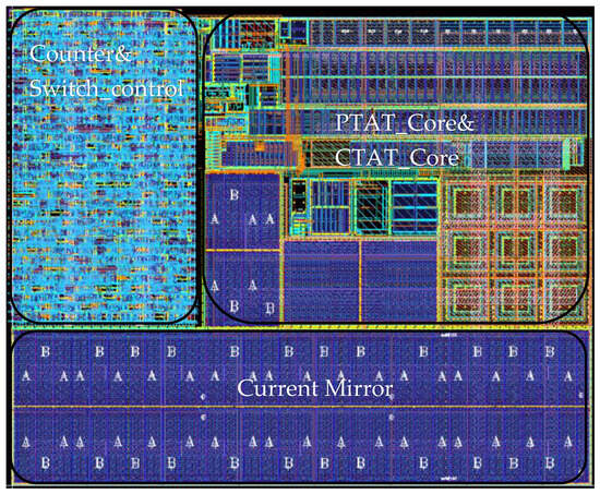 The temperature sensor consumes 1 uA at a room temperature of 27 °C and supplies 0.8 V. To achieve robust functionality under PVT (Process–Voltage–Temperature) variations, the current mirror is designed to operate at a minimum mirrored current of 5 nA. The charging current is set at 10 nA and the discharge current at 5 nA. A high-gain folded cascode operational amplifier with self-generated internal biasing ensures circuit stability and provides bias voltages to other operational amplifiers, maintaining a total power consumption of 100 nA. Given the circuit’s ultra-low power consumption, high-temperature device leakage effects must be accounted for, necessitating temperature sensor calibration. The circuit layout is shown in Figure 4, with an overall area of 214 μm × 258 μm.