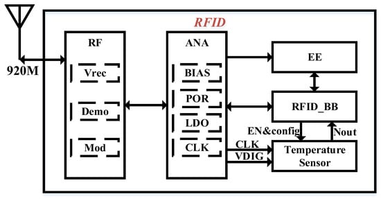 The overall architecture of the UHF (ultra-high-frequency) RFID chip is depicted in Figure 5. Within the RF section, the rectification module converts the ultra-high-frequency signal into the chip’s power supply, VDD. Upon receiving VDD, the analog section activates the BIAS module to generate the reference current required for the chip’s operation. When VDD reaches the power-on threshold defined by the Power-On Reset (POR) module, it outputs a high level, enabling the low-dropout regulator (LDO) and Clock Generation (CLK) modules to initiate normal operation. This process generates the digital voltage and reference clock necessary for the other chip modules. In this stage, the POR signal, clock signal, and digital power supply needed for the operation of the RFID Baseband (RFID_BB) module are fully prepared, allowing the RFID_BB to begin its initialization. During initialization, the RFID_BB retrieves system configuration parameters from the Electrically Erasable Programmable Read-Only Memory (EEPROM) to configure the RFID system. Once the initialization of RFID_BB is complete, the RFID system enters standby mode, awaiting commands from the reader. At this point, a write command is sent through the reader to activate the temperature sensor module, which measures the ambient temperature and returns the quantized temperature value to the reader. Since the RFID chip operates on radio-frequency energy, reducing overall power consumption is crucial for enhancing the chip’s sensitivity. Therefore, the described startup scheme has been adopted to minimize power usage. Additionally, once the chip enters standby mode, the energy consumed during command reception and data transmission is reduced to half of the original value. Considering the temperature sensor’s measurement time and the command time specified by the Gen2 protocol, the write command is employed to trigger the temperature sensor for temperature measurement, ensuring that the power consumption of the temperature sensor during operation remains lower than the total power consumption of the chip during command reception and data return.
