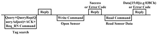 The use of the RFID temperature measurement function is depicted in Figure 6. When the reader identifies a tag and sets the tag in open or secured state, data 0000 h is written to the address 81 h to open the sensor, and then the read command is sent to obtain the data of the temperature sensor. Table 2, Table 3, Table 4 and Table 5 provide the description of the write and read command. In this work, several key abbreviations utilized within the command are presented below: