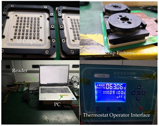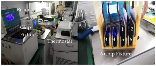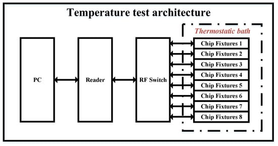 The chip was tested using a QR4453 reader controlled by a PC program, with the chip placed in a constant-temperature thermostat. As shown in Figure 7 and Figure 8, the system architecture and test environment for the chip evaluation are illustrated. The chip was selected and positioned in the constant-temperature thermostat, with the temperature measurement function activated via the program-controlled reader on the PC. The temperature readings from the chip were recorded at various set temperatures. During testing, the chips were placed in a custom-designed closed fixture, with each fixture capable of holding up to 96 chips simultaneously.