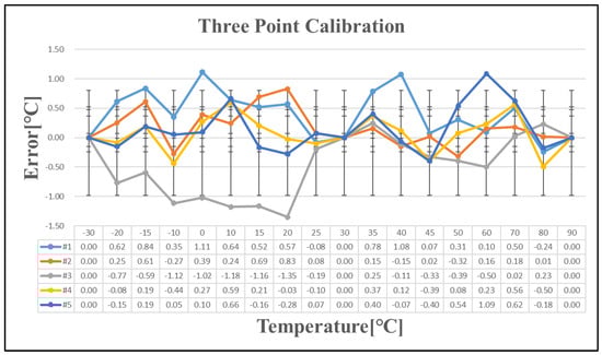 Five chips exhibiting a temperature error exceeding ±1 °C after one-point calibration were selected for further analysis. Table 7 presents the temperature errors of these five chips following one-point, two-point, and three-point calibration. As the number of calibration points increases, the linearity of the calibration improves. The temperature curve is effectively divided into multiple linear segments, reducing the overall temperature error with additional calibration points. However, implementing this approach in large-scale production presents significant challenges. Since a single wafer contains tens of thousands of chips, with each requiring testing at multiple temperature points, repeated measurements increase wafer stress and potential damage. Additionally, the cost of testing escalates with the number of calibration iterations, making extensive calibration impractical for mass production.