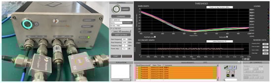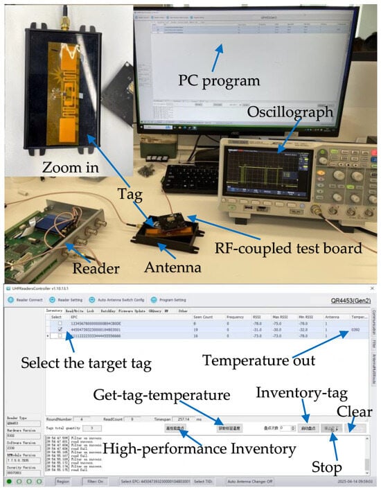 Figure 16 illustrates the RFID tag using a QR4453 reader controlled by a PC program and illustrates the shape of the signal that controls the RFID modulator circuit during the temperature measurement. First, the tag inventory should be selected through the PC program, the target tag should be selected, Get-Tag-Temperature should be clicked, and then the obtained temperature value (0392) is displayed in the program interface. RFID commands and reply signals are captured by using an RF-coupled test board which connects to an oscilloscope.