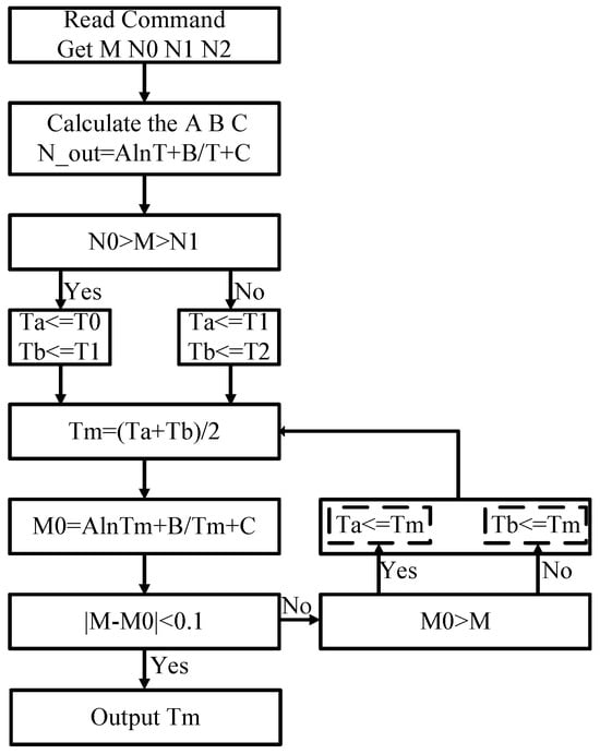 Figure 17 illustrates the specific implementation flow. The RFID mobile terminal sends read commands to obtain sensor data M and three calibration data points, e.g., N0(@−30 °C), N1(@27 °C), and N2(@90 °C). Then, coefficients A, B, and C are calculated from these calibration data. By comparing M with N0, N1, and N2 to determine the temperature range of M, the initial values Ta and Tb of the dichotomy are obtained. The temperature is obtained by successive approximation.