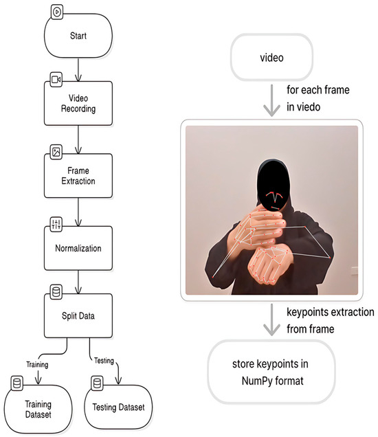 The combination of spatial and temporal features enhances the ability of the model to interpret complex gestures and improve its overall performance and real-world applicability. The MediaPipe Holistic model was used [29]. MediaPipe detects both human pose and hand landmarks, which refer to key points on the fingers and palm that represent the position and movement of the hand. Each video frame was processed using MediaPipe to extract 33 pose key points and 42 hand key points (21 for each hand). Each key point provides spatial information, including (x, y, z) coordinates, a visibility score for pose key points, and (x, y, z) coordinates for hand key points. This results in 258 features per frame, which were calculated as shown below.