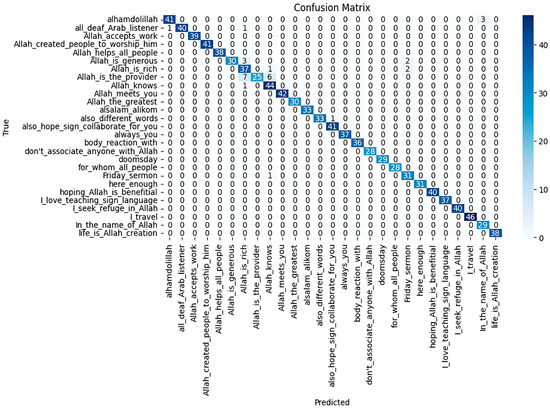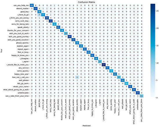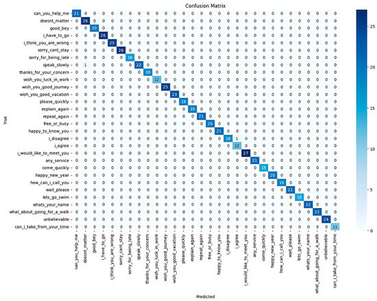 The enhancements made to the BiLSTM model dramatically improved its performance. With an accuracy rate of 0.97, precision rate of 0.98, recall rate of 0.97, and an F1-score of 0.97, the model now exhibited a robust ability to recognise sign language gestures. The confusion matrix further confirmed that the model had a low rate of misclassification, ensuring high reliability in real-world applications (Figure 9).