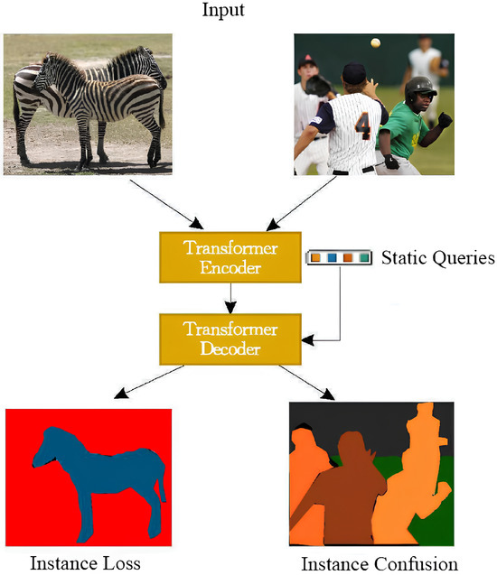 Query-based methods, with their end-to-end training approach and excellent sensor data processing capabilities, have emerged as a prominent area in panoptic segmentation research. These methods transform the panoptic segmentation problem into a query matching and decoding process, capturing global and local context information through interactions between queries and sensor feature maps. Query-based panoptic segmentation approaches typically require the manual construction of initial query variables as input, where each “instance mask” and “semantic mask” in the final segmentation results must correspond to a separate query vector. This makes the determination of the initial query quantity a critical challenge. However, static query methods represented by Mask2Former [11] exhibit significant limitations when processing dynamic visual sensor data: firstly, static queries employ preset fixed quantities (typically 100 or 200), which perform poorly when handling varying numbers of targets across different scenarios. The actual number of instances in input images is typically unknown in advance-insufficient query quantities, leading to instance loss, while excessive quantities create unnecessary overhead. For instance, in complex urban scenes from the Cityscapes dataset (averaging 25 instances/image), 75% of queries are wasted when actual instances are far fewer than preset queries; in complex scenarios from the MS COCO dataset, where instance counts approach or exceed preset values (over 100 instances in some images), this leads to sensor-captured instance loss/confusion (as shown in Figure 1), even causing single queries to correspond to multiple instance masks. Secondly, static queries remain completely independent of sensor input, relying solely on learned fixed-parameter representations, severely limiting model adaptability to different scene characteristics. Finally, static queries require iterative optimization through multiple decoder layers to achieve good representations. This not only increases computational complexity but also extends inference time, adversely affecting the real-time performance of visual sensor systems—particularly detrimental for time-sensitive applications like autonomous driving.