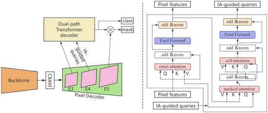 In traditional Transformer decoders, a single-path update strategy is typically employed, which involves updating either pixel embeddings or query embeddings. This unidirectional information flow may lead to the insufficient utilization of information, limiting the model’s expressive power. To address this issue, this section proposes a dual-path update strategy as shown in the dotted box on the right side of Figure 2, inspired by the expectation–maximization (EM) algorithm. This strategy alternately updates pixel features and queries, enabling them to exchange information more comprehensively, thereby achieving a more refined feature representation and improving the model’s learning efficiency and prediction accuracy.