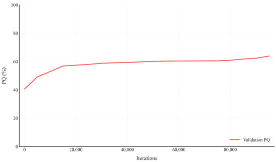 Figure 6 shows the panoptic quality () metric on the validation set throughout training: starts at around 40% and shows steady improvement. There is a noticeable jump in performance in the early stages (up to 20,000 iterations). The metric reaches approximately 55–60% by 20,000 iterations. The performance continues to improve but at a slower rate thereafter. Slight fluctuations in the validation are normal and expected. The training process is stable without signs of overfitting (as the validation continues to improve). Overall, the metric indicates that the model is learning effectively and improving its performance on the validation set over time.