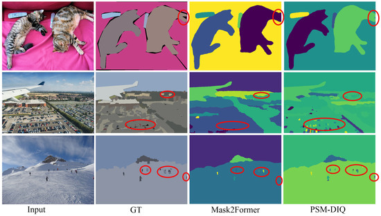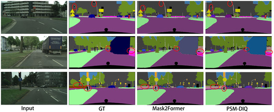 Analysis of cityscape dataset results (Figure 7): Small target detection capability: as can be seen from the red circle area, PSM-DIQ can more accurately identify and segment small targets such as pedestrians, traffic signs, and street lights on the road, while Mask2Former has obvious omissions in these areas. Edge accuracy: PSM-DIQ is more accurate in processing object edges, especially at the junction of vehicles and backgrounds, buildings, and the sky. Scene coherence: PSM-DIQ’s segmentation results are more coherent, reducing the fragmented segmentation phenomenon of Mask2Former. Sky region processing: in the first row of images, PSM-DIQ’s segmentation of the sky region is closer to the ground truth, while Mask2Former performs poorly in this area.