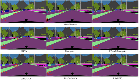 To verify the contribution of each module in the proposed network, ablation experiments were conducted on the Cityscapes dataset. These experiments provide a deeper analysis of the PSM-DIQ model, focusing on validating the effectiveness of its key components. We designed the following experiments, primarily focusing on three core components: the convolutional block attention module (CBAM), instance activation (IA)-guided queries, and the dual-path update strategy. These components were individually evaluated by systematically removing them from the complete model. For the experimental setup, ResNet-50 was used as the backbone network within the PSM-DIQ model. To comprehensively evaluate model performance, the CBAM attention module, the instance-activation-guided query module, and the dual-path Transformer decoder were incrementally added to the baseline network. The results are shown in Table 3, where “-” indicates that a component was not used in the network structure and “✓” indicates that it was used.