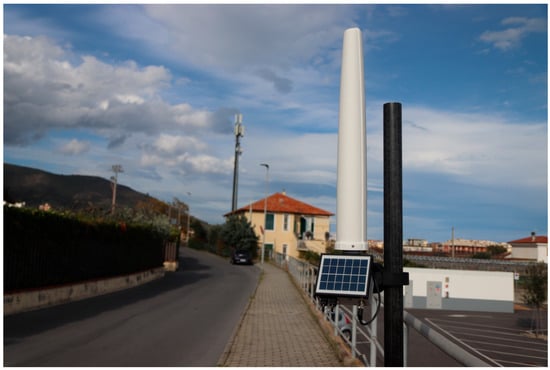 - Azaro, R.; Franchelli, R.; Gandolfo, A. Networks of EMF Area Monitor for Distributed Human Exposure Monitoring: Assessment of Performances in Simulated Realistic Scenarios. In Proceedings of the IEEE International Symposium on Measurements & Networking (M&N), Padua, Italy, 18–20 July 2022. [Google Scholar]