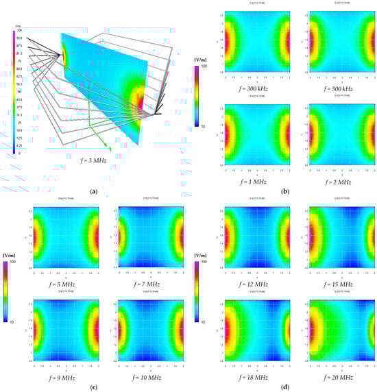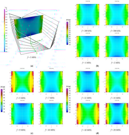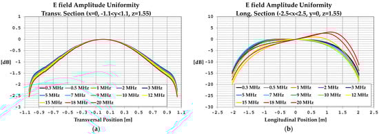 | Freq. [MHz] | Transversal Section (x = 0, −0.5 < y < 0.5, 1.05 < z < 2.05) | Longitudinal Section (−0.5 < x < 0.5, y = 0, 1.05 < z < 2.05) | ||||||
