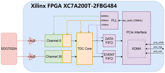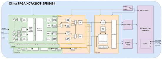 The proposed FPGA-TDC, as shown in Figure 3, is a 66-channel heterogeneous delay chain TDC based on the open-source jTDC. The jTDC provided an important foundation and design concepts for the development and verification of the digital system in this research. The jTDC is a multi-channel TDC open-sourced by BIELING John [14] from the University of Bonn, featuring a design precision of 30 ps and scalability up to 98 channels, while integrating both pulse counting and time-to-digital conversion functionalities. The 98 extendable channels of jTDC are divided into three groups of 32 LVCMOS33 standard channels each, plus two NIM standard channels serving as trigger inputs, forming a 96 + 2 channel configuration. Being built on jTDC, the proposed TDC implements a design utilizing 64 sampling channels and two trigger channels (64 + 2 channels), while maintaining scalability. Both sampling and trigger channels employ the LVCMOS33 input standard.