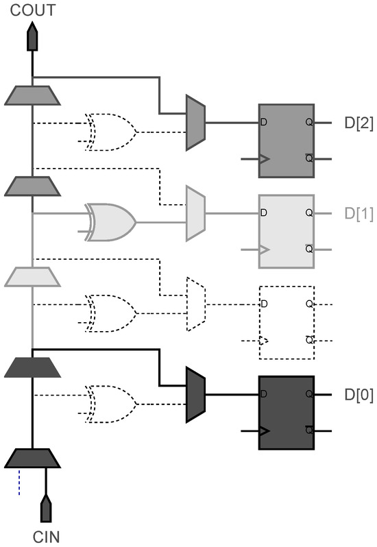 However, the 4-tap heterogeneous delay chain configuration still exhibits significant numbers of empty or low-delay bins. Considering the relatively stable propagation delay characteristics of cascaded carry chains with optimized lengths, implementing a 3-tap heterogeneous chain configuration enables effective consolidation of empty or low-delay bins. Building upon this principle, our research proposes a novel 3-tap heterogeneous CSC delay chain architecture designed to enhance both uniformity and precision in TDL implementations. As illustrated in Figure 4, distinct gray-scale paths represent signal propagation trajectories of equivalent bins. In this CSC configuration, the most significant bit D[2] and least significant bit D[0] utilize direct carry (C) outputs, while the intermediate bit D[1] employs XOR (S) gate outputs for optimized timing distribution.