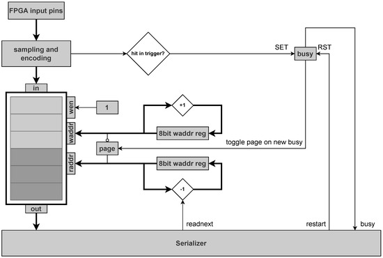 The proposed FPGA-TDC employs identical data processing methodology to jTDC, with its core functionality leveraging FPGA Block RAM (BRAM) resources. Capitalizing on the abundant BRAM capacity inherent to modern FPGAs. As illustrated in Figure 5, the input data of each channel is directly stored in the BRAM without doing any buffering, filtering or sorting. To record data even during read-out, the TDC use a second memory page. On trigger input, the recording is not stopped but simply continued in that second memory page by flipping a page bit. The former write-to-page can be switched to become the read-from-page by using the page bit as the 9th bit of the BRAM read address and the inverted page bit as the 9th bit of the BRAM write address. To prevent further page flipping until the read-from-page has been read-out completely, the page bit is locked until a “restart” command is send. For each input channel, the BRAM has to store the single hit bit (hit or no hit) and the 8bit high resolution time information.