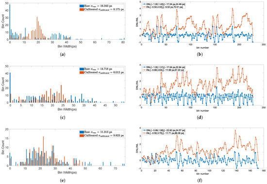 Statistic Analysis of bin width for different TDL configurations. (a) Bin width distribution of 4-tap CCCC configuration. (b) Calibrated linearity of 4-tap CCCC configuration. (c) Bin width distribution of 4-tap SCSC configuration. (d) Calibrated linearity of 4-tap SCSC configuration. (e) Bin width distribution of 3-tap CSC configuration. (f) Calibrated linearity of 3-tap CSC configuration.