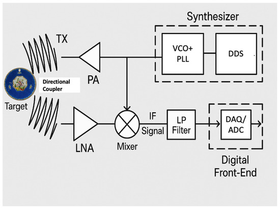Functional block diagram of the frequency-modulated continuous-wave (FMCW) radar system used in this study. The Direct Digital Synthesizer (DDS) generates a highly linear digital ramp, which is used to drive a Phase-Locked Loop (PLL) that controls the Voltage-Controlled Oscillator (VCO). The output signal from the VCO is then amplified by a Power Amplifier (PA) before being transmitted through the TX antenna. The reflected signal, delayed due to the propagation back and forth to the object, is first amplified by a Low-Noise Amplifier (LNA) to minimize noise and then guided toward the detection circuit with a directional coupler linked to a multiplexer, where it is mixed with the reference signal. The resulting intermediate frequency (IF) beat signal is filtered and digitized by an Analog-to-Digital Converter (ADC), acting as the data acquisition (DAQ) system. The entire setup enables high-resolution distance measurements based on propagation-induced phase delays and beat frequency extraction.
