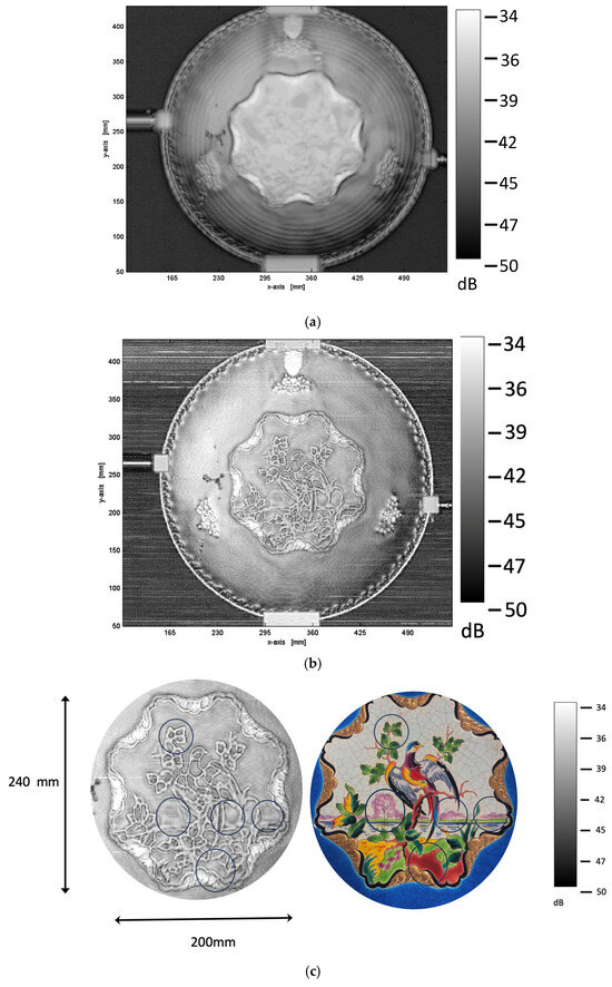 The plate has a circular shape with fairly symmetrical radial patterns. The concentric rings in Figure 3a are likely related to the internal structure or surface texture of the ceramic. In radar imaging, the internal structure causes phase shifts, causing constructive and destructive interference patterns. The rings around the center may result from multiple interference phenomena with internal reflections, which are typical in high-frequency radar imaging. It is important to note that, to make ceramic objects by casting, industrials did not start from clay bread but from clay in liquid form. The piece of art was left to dry in a mold before being removed and air-dried. Then, ceramics were hand-painted on both sides, so the object was completely enabled. The structure is a tri-layer of enamel/clay/enamel (approximately 0.65 mm/4–5 mm/0.65 mm), which contributes to the observed interference patterns; however, the layer-specific resolution remains below the system′s longitudinal capability and thus cannot be individually resolved.