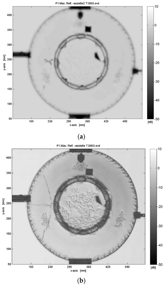 Figure 4a shows the ceramic plate measured by radar imaging in transmission at 100 GHz. Comparing it to the reflection image at 100 GHz, several differences and observations can be made. The transmission image appears much more uniform with fewer interference patterns compared to the reflection mode. This is because transmitted waves are less affected by surface roughness and reflectivity variations. Higher contrast is observed around internal structures, and the propagation of the fractures inside the plate is detected. The dynamic range in dB is different from the reflection mode, highlighting different scattering mechanisms and attenuation paths. Also, transmission mode emphasizes absorption and phase shift through the material, whereas reflection emphasizes surface reflection and refraction. The dynamic range observed in the transmission images (Figure 4) is comparable to that in the reflection images (Figure 3). However, the smoother contrast in transmission mode is primarily due to different propagation mechanisms and attenuation effects, rather than a limitation in dynamic range. Based on the estimated dielectric parameters, the transmitted signal is expected to drop by nearly 95% over a 5 mm thickness, leading to significant signal attenuation and high contrast in transmission mode. We added a piece of metallic tape stuck on the back surface of the plate (a square and a polygon shape) to check the transparency of the multilayer ceramic object. Figure 4b presents the transmission-mode image of the enamel plate acquired at 300 GHz. Compared to the 100 GHz image (Figure 4a), this higher-frequency scan reveals significantly finer internal structures and micro-fractures within the ceramic material. Notably, the transmission image uncovers subtle internal features that remain invisible in optical or lower-frequency THz imaging, indicating potential variations in material density or firing inhomogeneities. These structural details are crucial for evaluating the conservation state of heritage ceramics. However, the image also shows attenuation artifacts, especially in the central area.