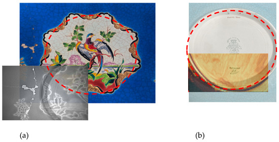 At last, a central darkest circular zone is visible for both frequencies. We also provided, in Figure 5a, the superposition of the visible and an X-ray image of the central part of the plate. Figure 5b is the rear visible image of the central zone of the plate, combined with a THz imaging scan performed with a time-domain spectro-imaging setup in reflection. So, a typical plate consists of several distinct parts. The well is the central, recessed area where food is served. The lip surrounds the well and is usually a flat or slightly inclined section that rises gently or runs parallel to the base. While often mistaken for the rim, the lip varies in width depending on the design and is not always present. The rim refers to the outermost edge of the plate, which is often decorated, for example, with gilding or painted details. The base (shown by a red dot circle in Figure 5) is the underside of the plate, sometimes featuring a foot ring to elevate it slightly from the surface that it rests on. In transmission mode, this added thickness of the base hides and alters the analysis in the central part of the plate of the surface details (see Figure 4 for FMCW transmission images and Figure 5a for X-ray image). The TDS THz image (inserted in the lower part) reveals internal structures of the plate that are invisible to the naked eye and on FMCW images. This is probably linked to variations in the reflected field and indicated differences in density during the firing of the ceramic, as well as during the casting of the piece. Plaster molds are generally used for the manufacture of pieces.