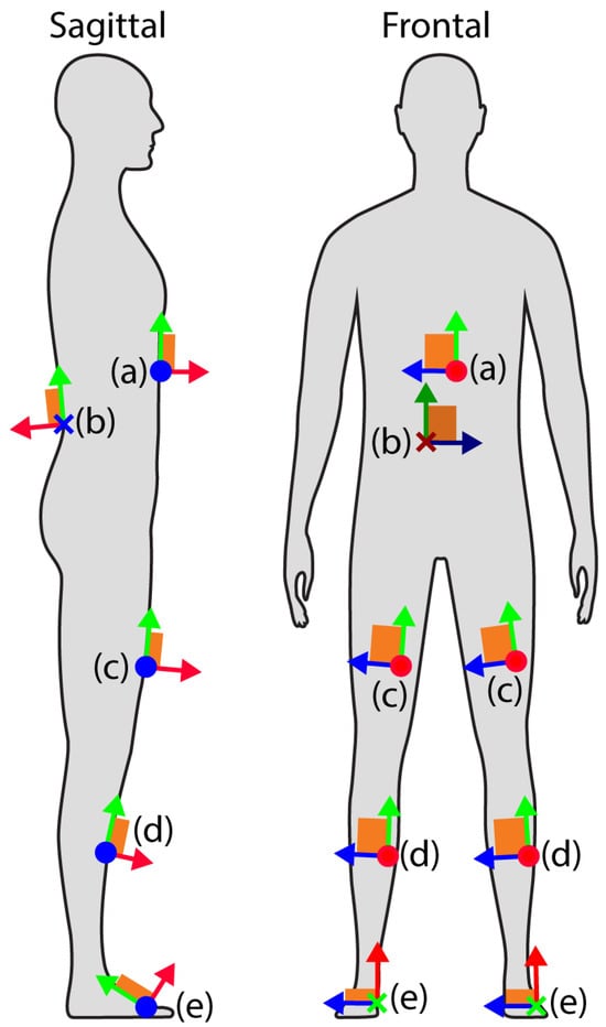 IMU Placement. IMU-fixed coordinate systems are shown, with x-axis (green), y-axis (blue), and z-axis (red). Sternum (a): at or slightly superior to the xiphoid process; sacrum (b): superior to the midpoint between the posterior superior iliac spine; thigh (c): anterior, approximately 15 cm proximal to the knee joint center defined by the midpoint between the femoral condyles; shank (d): anterior, approximately 15 cm distal to the knee joint center; foot (e): dorsal aspect halfway between the metatarsophalangeal joint and the ankle joint.