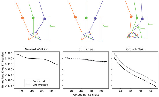 Illustration of corrections to the knee joint S/I position during stance phase for different gait presentations, namely, a stiff or flexed knee gait. The different colors in each of the panels indicate the same time point for each potential walking condition, Orange: Initial Contact, Green: Mid-stance, Blue: Terminal Stance.