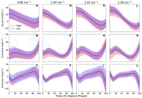 Ensemble averages of time normalized stance phase lower extremity joint angles across participants during normal walking on a treadmill at four different speeds (0.80 m s−1 panels (A–C), 1.00 m s−1, panels (D–F), 1.25 m s−1, panels (G–I) and 1.50 m s−1, panels (J–L)). The solid lines and transparent error bands denote the mean and one standard deviation, respectively.