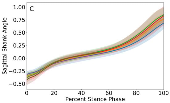In a previous work, the LLTE has been limited to use as a simulation and design metric for custom prosthetic feet [11,12,25,26] to encourage gait symmetry in persons with unilateral transtibial amputation. Here, we have extended its use as a biofeedback metric given its unique properties of consolidating multiple kinematic features into a single scalar value. For the purpose of gait training, the two major determinants of the LLTE appear to be the A/P position of the knee and the shank angle swept out during stance phase, while the S/I position of the knee is less variable and therefore more valuable as a design metric for prosthetic ankle–feet (i.e., build height), as shown in Figure 6 and Figure 7. Calculating the LLTE with an IMU requires a number of assumptions and corrections that are not necessary when using marker-based motion capture, as described in the methods in Section 2.1.4. The component trajectories approximately match those presented in the previous work, and the calculated LLTE values are slightly lower than values from the previous studies ( compared to ) [10,11], although those studies compared prosthesis user trajectories to able-bodied.