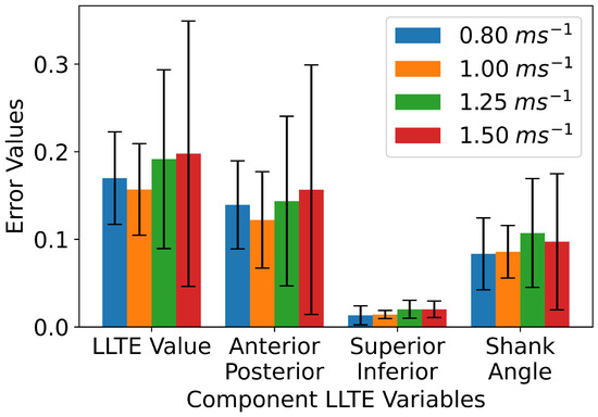 During stance phase, the LLTE components appear similar across the range of speeds when normalized to stance time to match the time-normalized LLTE target (Figure 6). The ANOVA results suggested no significant effect of speed on LLTE (, , ). These findings suggest that LLTE values are uncorrelated to gait speed changes across the range of tested speeds when using the aggregate 0.80 ms−1 as the target trajectory. The contributions of the A/P and S/I knee position and shank angle components to the total LLTE are shown in Figure 7. At each walking speed, the A/P knee position had the greatest effect on the overall LLTE, with the angle swept out by the shank having slightly smaller effect and the S/I shank angle having minimal effect on the LLTE across all tested speeds. It is notable that there are high levels of variability for the A/P error component, which, in turn, dominates the variance of the LLTE values.