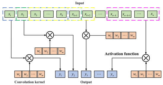 Grinding wheel wear is a complex process, and a Convolutional Neural Network (CNN) can better extract the information and features related to wheel wear prediction. By moving the convolutional kernel across several input sequence locations, the CNN can effectively capture the sequence data’s varying local patterns and features. As illustrated in Figure 1, the convolutional layer captures local features from the time series data by using a sliding window.