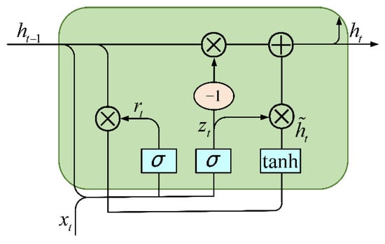 Although the Recurrent Neural Network (RNN) has the advantage of being able to extract contextually relevant information, it can access a minimal range of contextual information and suffers from the problem of long-term dependency. Therefore, it is essential to introduce a threshold mechanism into the RNN structure to preserve the necessary information. It can not only be an effective solution to the issues of gradient vanishing and gradient explosion but also can partially address the shortcomings of the difficulty of transmitting information over long distances. The more commonly used RNN structures with gate mechanisms are Long Short-Term Memory (LSTM) and Gated Recurrent Unit (GRU) architectures, which have temporal solid processing capability. However, because GRU does not need to retain memory, the network’s internal structure has only two gates, which saves memory space, reduces the training parameters, and results in faster training speed. Figure 2 illustrates the basic structure of a GRU model, and the forward GRU computational formula is as follows: