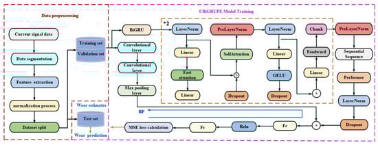Figure 4 illustrates the structure of the CBiGRUPE model, which involves three main parts: data processing, model training, and wear prediction. The *2 symbol indicates that the model contains two identical modules, both enclosed in yellow boxes, which are the same in structure and function.