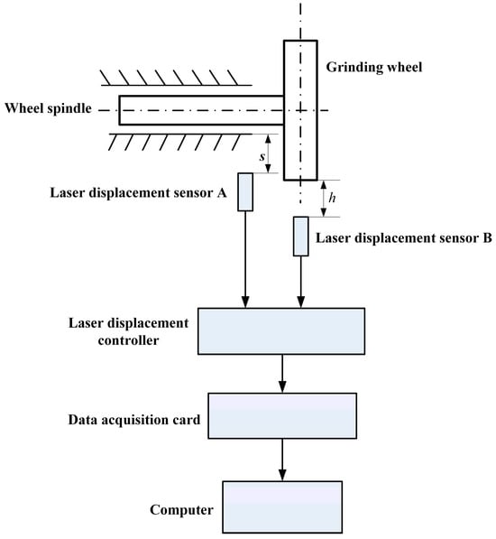 The measurement principle of the online detection system is shown in Figure 6. As can be seen from the figure, the position of sensor A is facing a fixed point on the grinding wheel spindle, and its distance to the grinding wheel spindle is s. Sensor B is installed in the position passing through the centerline of the grinding wheel, and its distance to the centerline of the grinding wheel is h. During the grinding process, with the continuous abrasion of the grinding wheel, the gap between the grinding wheel and the laser sensor increases. Therefore, in the calibration experiment, the grinding wheel wear can be simulated by the upward movement of the grinding wheel bracket. The calibration process is as follows: